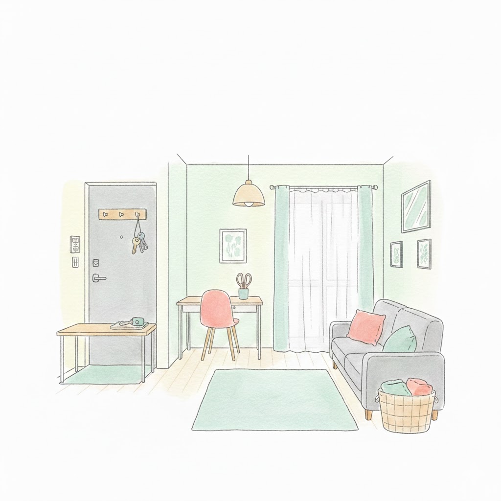 家中の物に住所を作る必要はありません。まずは毎日必ず使う**「鍵・財布・スマホ・メガネ」**。この4つにだけ、最高の特等席を用意してください。これだけで朝の出発がスムーズになり、心にゆとりが生まれます。
